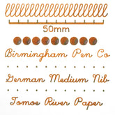*HIGHLY SATURATED COLORANT LOAD. INK COLOR WILL VARY SIGNIFICANTLY WITH SATURATION AND PAPER TYPE. The rich saturation increases viscosity and will cause the ink to wry dry in some pens. Our writing samples are complete with a German medium point grade nib on Tomoe River paper.