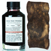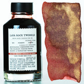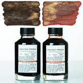 Lava Rock Twinkle flows across the page in a basaltic red that deepens into a shadowy iron ore in saturation, illuminated by a finely dispersed golden sparkle. Paired with it, Gold Vein Twinkle emerges from an umber tinted black base threaded with a luminous pigment like native gold deposits precipitated along a metamorphic rock fracture. For best color character, use a broad nib with wet flow to unlock every visual dimension.