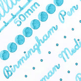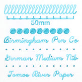 Kingfisher is part of the Delicate Formula fountain pen ink line, best for pens and projects that benefit from colorants that wash easily from most surfaces with water. Our ink color swatch is produced with a cotton swab on Tomoe River paper. The 50mL volume will provide approximately 62 standard converter refills assuming a 0.8mL draw. Glass bottles arrive prepared in our beautifully foiled Birmingham Pen Co. gift box.