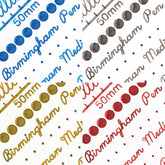 Each 50mL volume will provide approximately 62 standard converter refills with an average 0.8mL draw. Rigid glass bottles arrive individually wrapped in cellulose wadding and prepared in a beautifully foiled gift box. Our ink color swatches and writing samples are produced on Tomoe River paper with a cotton swab and medium point grade nib.