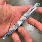 Icefall is cool and quiet—soft white resin streaked with icy teal-gray, like glacial water frozen mid-motion. Reserve this lightweight machined resin pen in our Model-C style with house clip.