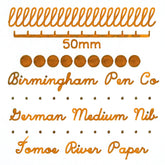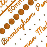 Tiger's Eye is part of the Keystone Formula fountain pen ink line, our traditional dye-colorant ink. The 50mL volume will provide approximately 62 standard converter refills assuming a 0.8mL draw. Our ink swatch is produced with a cotton swab on Tomoe River paper.
