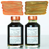 These Pennsylvania-made dye–pigment hybrid fountain pen inks arrive in thick 90mL glass bottles with lined metal caps and a copper foil-stamped gift box.